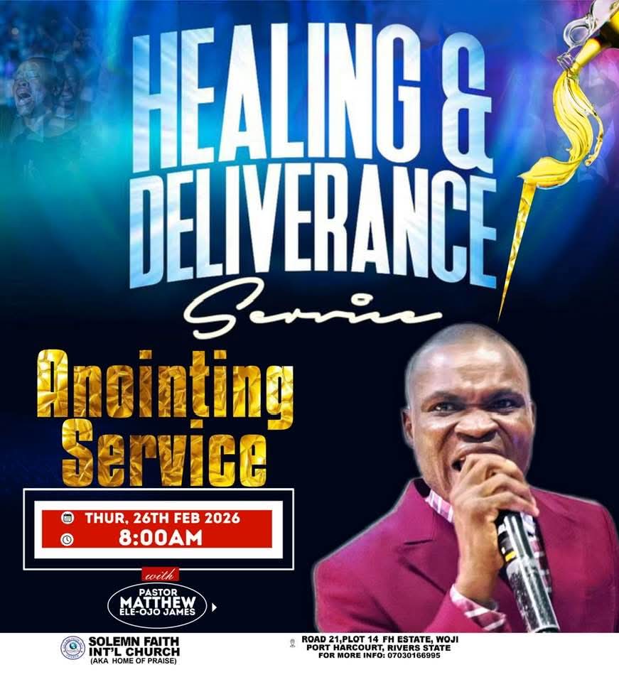 The General Overseer of Solemn Faith International Church, located at Road 21, Plot 14, Federal Housing Estate, Woji, Port Harcourt, has announced a special Healing and Deliverance Service scheduled to hold this Thursday, 26th February 2026.